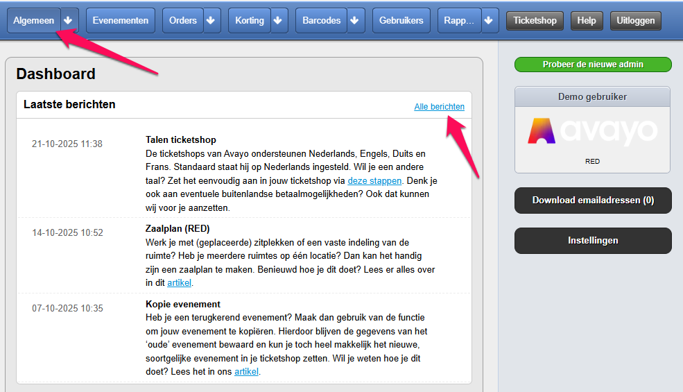 In het dashboard worden berichten geplaatst met betrekking tot het systeem. Ook worden hier berichten geplaatst die betrekking hebben op de bestellingen van bezoekers (orders).