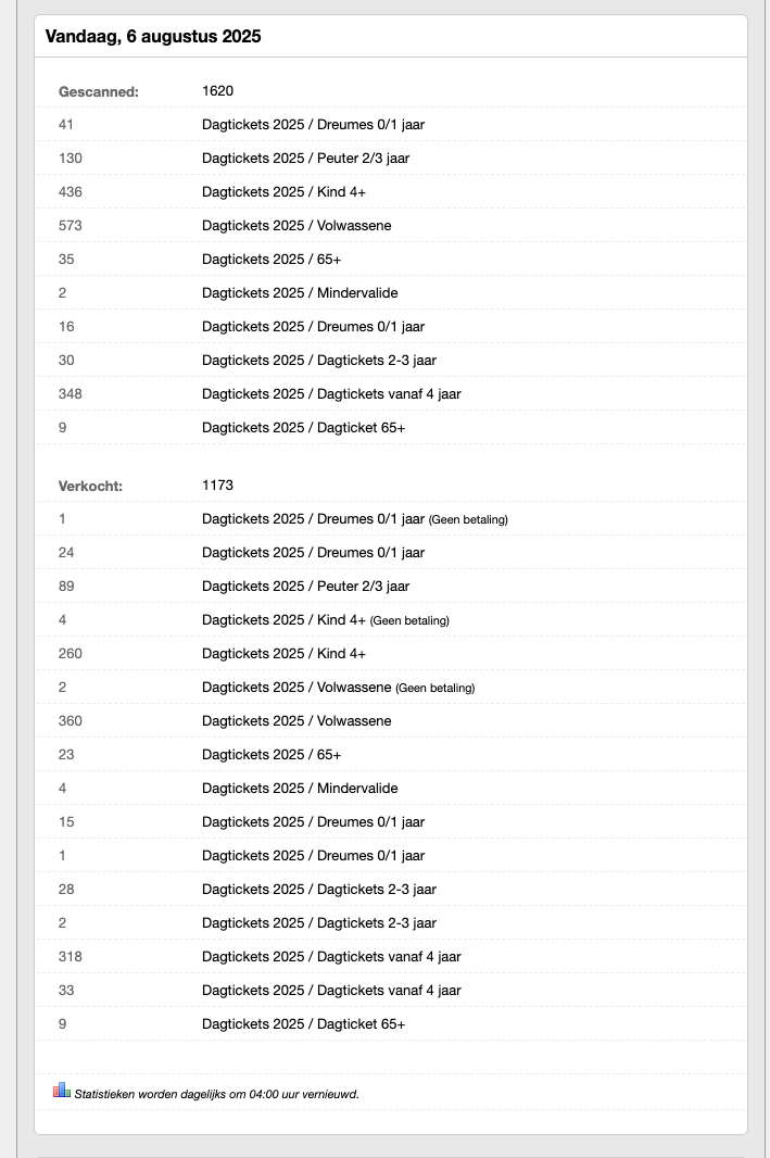 Ook kun je op het dasboard zien hoeveel tickets er die dag zijn verkocht en gescanned. Daarmee weet je dus ook hoeveel mensen er binnen zijn. Ook worden de aantallen per soort getoond. Het verkoopkanaal wordt ook getoond als deze afwijkt van de standaard (online).