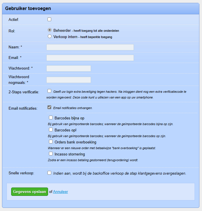 Vul in het scherm wat nu verschijnt alle benodigde gegevens in. Bij ‘Rol’ kun je kiezen tussen Beheerder en Verkoop intern. Hieronder wordt de inhoud van deze rollen uitgelegd.