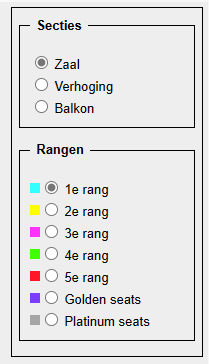 Secties: Denk hier aan 1e ring, 2e ring. etc. of aan zaal, verhoging, balkon etc. Voer ze als volgt in: Zaal, Verhoging, Balkon.