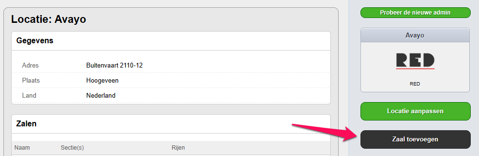 Er volgt nu een overzicht van alle zalen op die locatie. Via de optie ‘Zaal toevoegen’ kun je een nieuwe zaal toevoegen. Vul de gegevens in die gevraagd worden. Sla daarna op door de knop onderaan.