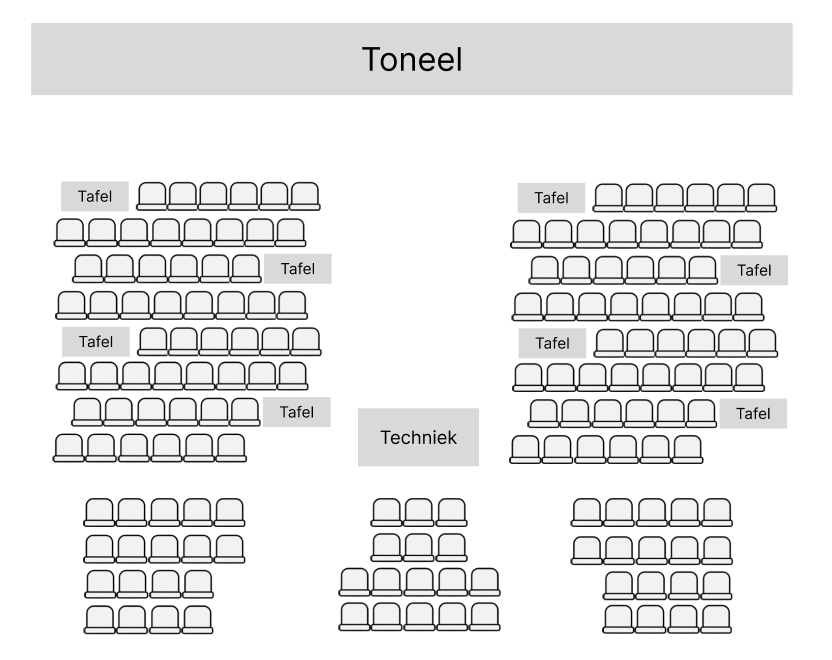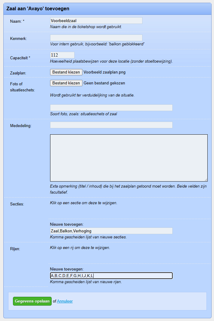Zaalplan: Hier kun je een plattegrond van de zaal uploaden. Deze kan dan later gebruikt worden voor het reserveren van plaatsen/stoelen. Voorbeeld zaalplan: