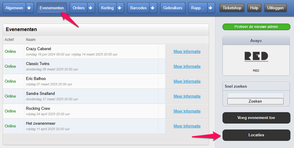 Ga als eerste naar https://admin.avayo.nl/ en log in met het door jouw opgegeven e-mailadres en wachtwoord. Je komt dan in het beheersysteem van de ticketshop.