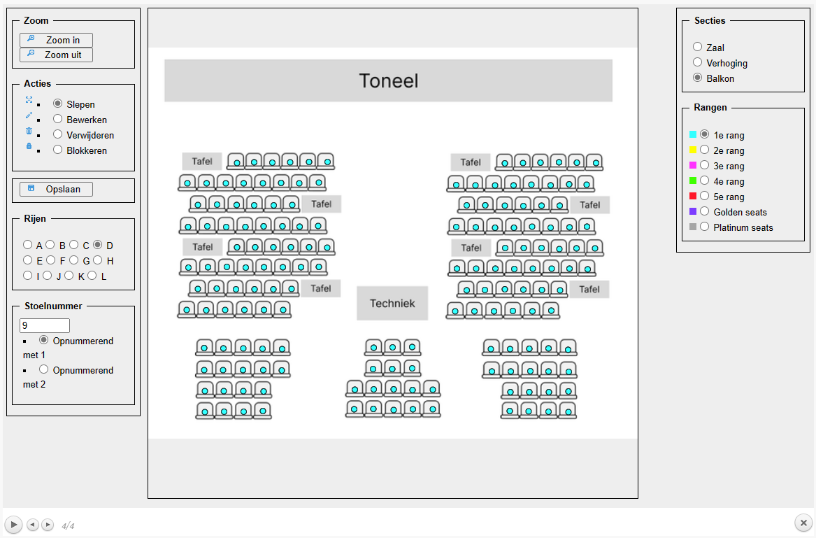 De stoelen worden in de zaalplan editor weergegeven als stipjes. Links kun je de rij-gegevens en stoelnummers aangeven.