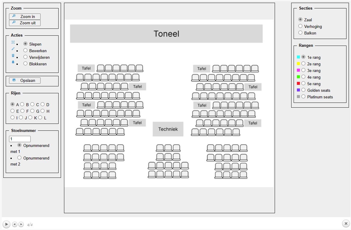 Tip: De zaalplan editor slaat niet automatisch de wijzigingen op dus zorg dat je met regelmaat even links op ‘Opslaan’ drukt.
