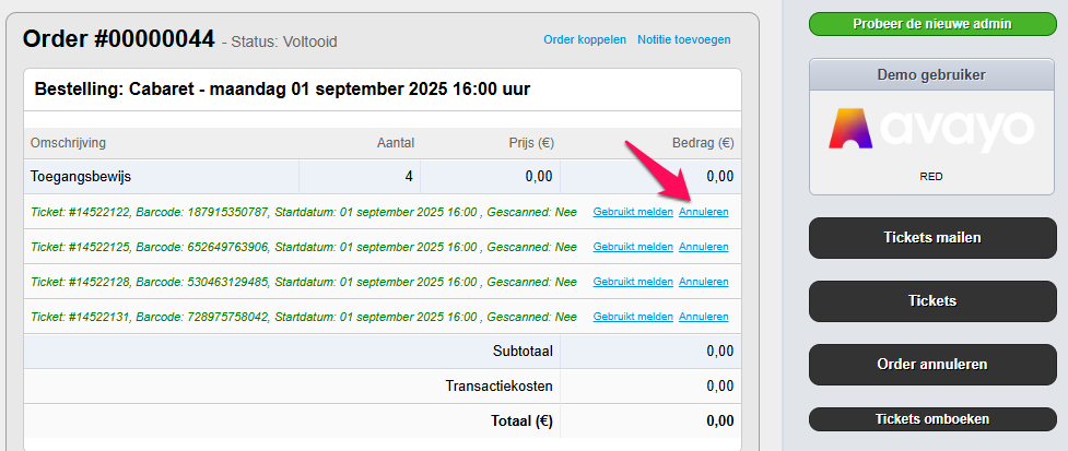 Annuleer het onjuiste ticket door op ‘Annuleren’ te klikken achter het betreffende ticket. Bevestig vervolgens de annulering.