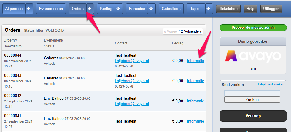 Ga naar het menu ‘Orders’ en kies ‘Informatie’ achter de betreffende order.