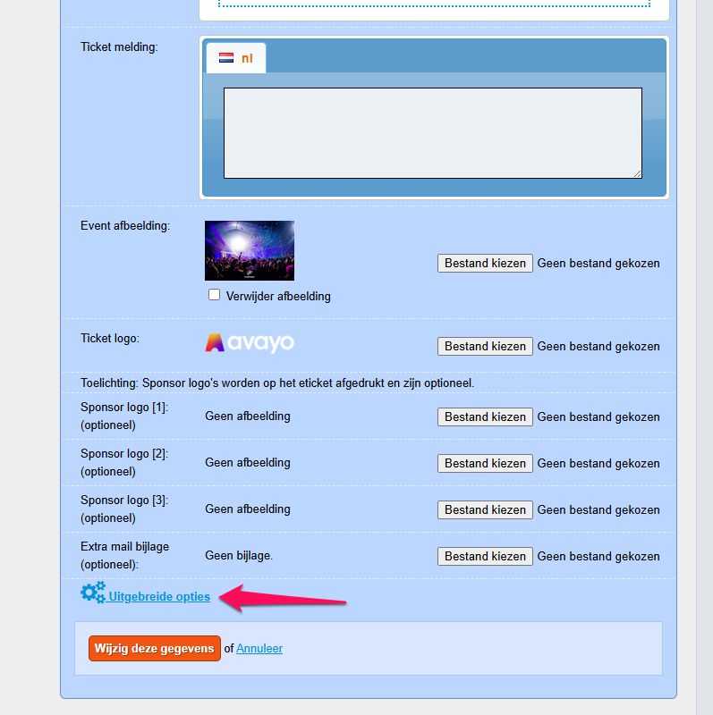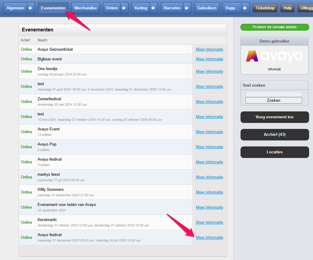 Ga als eerste naar https://admin.avayo.nl/ en log in met het door jouw opgegeven e-mailadres en wachtwoord. Je komt dan in het beheersysteem van de ticketshop.
